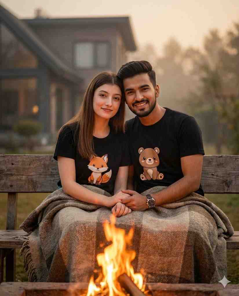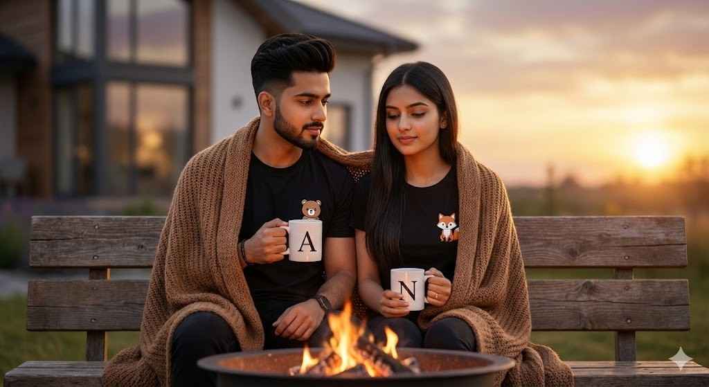 A cute young Indian couple sitting closely on a wooden bench during a cozy winter evening. Both are wrapped together in a warm knitted brown blanket. The boy is wearing a black t-shirt with a cute cartoon character print, neatly styled hair and a trimmed beard, holding a white coffee mug with the letter “A”. The girl is wearing a matching black t-shirt with a cartoon character print, long straight hair, natural makeup, holding a white coffee mug with the letter “N”. A small campfire is glowing warmly in front of them, creating soft orange light. The background shows a calm outdoor setting with a modern house slightly blurred, golden sunset sky, shallow depth of field, ultra-realistic skin texture, soft cinematic lighting, cozy romantic mood, professional DSLR photography look, high resolution, Instagram-viral aesthetic.