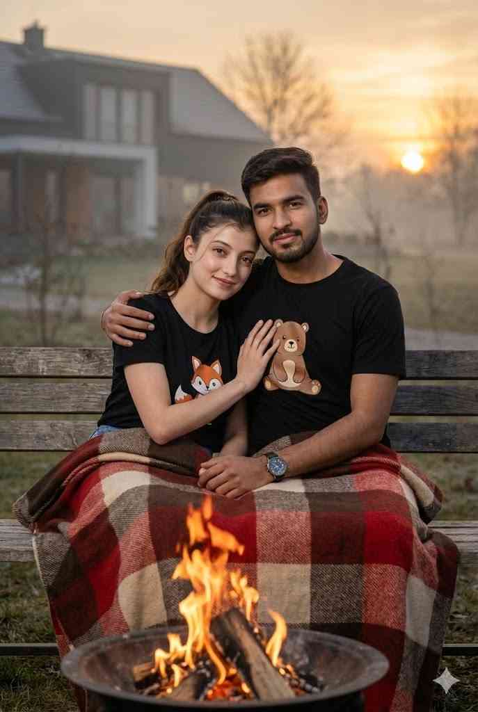 A cute young Indian couple sitting closely on a wooden bench outdoors during a cozy winter evening. Both are wrapped together in a warm textured blanket. The boy is wearing a black t-shirt with a cute cartoon character print, neatly styled hair, trimmed beard, and a wristwatch, smiling softly. The girl is wearing a matching black t-shirt with a cartoon character print, long straight hair, natural makeup, and a gentle smile. They are holding hands affectionately. A small campfire is glowing warmly in front of them, casting soft orange light on their faces. The background shows a calm outdoor setting with a modern house slightly blurred, misty atmosphere, golden-hour dusk lighting, shallow depth of field, ultra-realistic skin texture, cinematic warmth, professional DSLR photography look, high resolution, Instagram-viral cozy aesthetic.