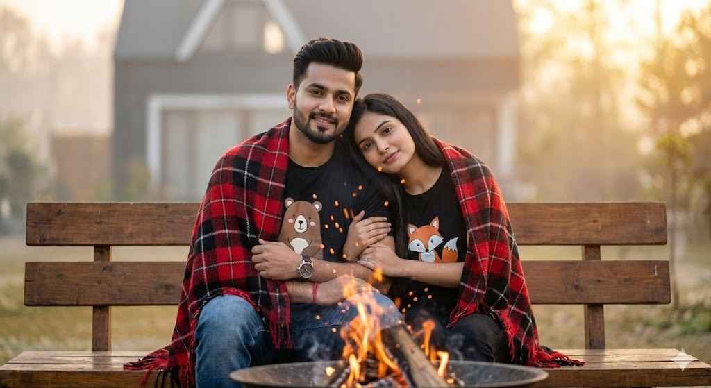 A cute young Indian couple sitting closely on a wooden bench outdoors during a cozy winter evening. Both are wrapped together in a warm checkered blanket, sitting shoulder-to-shoulder. The boy is wearing a black t-shirt with a cute cartoon character print, neatly styled hair, trimmed beard, jeans, and a wristwatch, smiling softly at the camera. The girl is wearing a matching black cartoon-print t-shirt, long straight hair, minimal makeup, and a gentle smile, resting her head on the boy’s shoulder and holding his arm affectionately. A small campfire is burning in front of them, casting warm orange glow and sparks. The background shows a misty outdoor setting with a modern house slightly blurred, soft sunset light, shallow depth of field, ultra-realistic skin texture, cinematic warm lighting, professional DSLR photography look, high resolution, Instagram-viral cozy couple aesthetic.