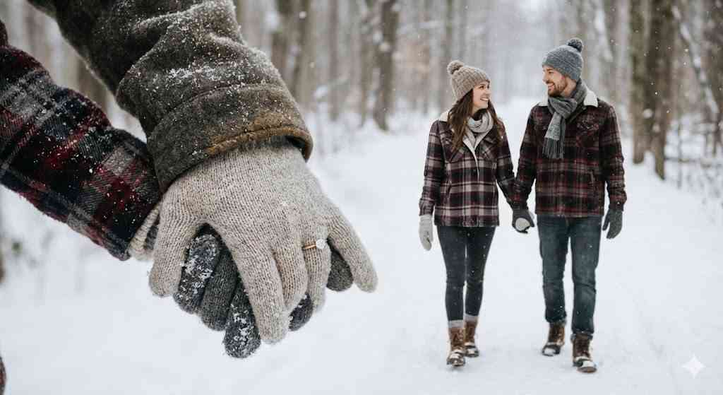 A cinematic winter love scene showing a symbolic close-up of two hands holding tightly in the foreground, one hand wearing a simple engagement ring. In the background, slightly blurred, a young couple walks together through a snowy landscape, holding hands and smiling naturally. Both are dressed in cozy winter outfits—plaid jackets, warm layers, beanies, and boots. Soft snowfall, minimal color palette, calm winter atmosphere, emotional storytelling composition with foreground focus and background depth. Natural cold daylight, shallow depth of field, ultra-realistic skin texture, cinematic framing, professional DSLR photography look, high resolution, Instagram-viral romantic aesthetic.