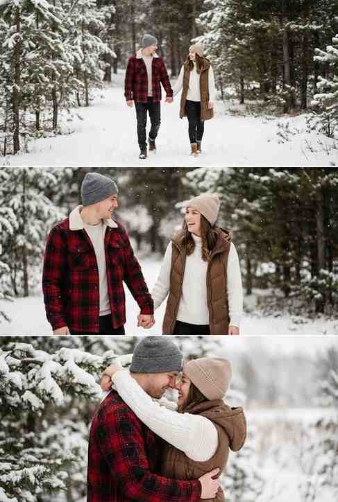 - Snowy forest and winter outfits create a calm, timeless romantic mood