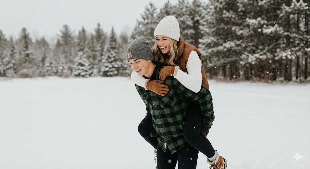 A playful young couple enjoying a joyful winter moment in a snowy open field. The boy is giving the girl a piggyback ride, wearing a green plaid winter shirt, dark pants, gloves, and a beanie. The girl is laughing happily, wearing a white beanie, white full-sleeve sweater, brown sleeveless jacket, winter gloves, and boots, looking sideways with a bright smile. Light snowfall is visible in the air, with a soft blurred forest background. Natural cold daylight, candid action shot, shallow depth of field, realistic skin tones, cinematic winter mood, professional DSLR photography look, high resolution, Instagram-viral cozy winter aesthetic.
