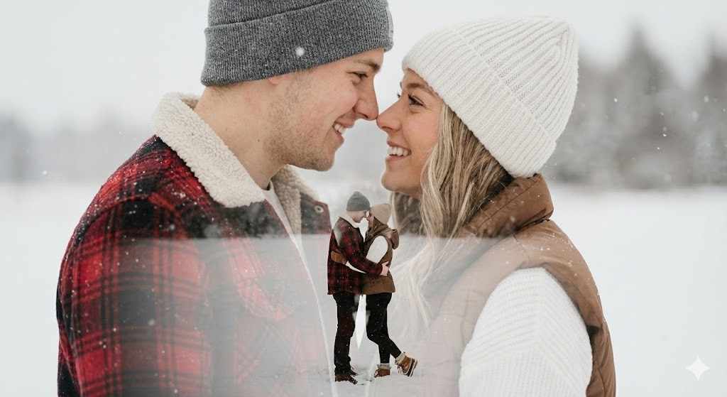 A romantic double-exposure winter portrait of a young couple in a snowy landscape. Primary layer: a close-up of the couple facing each other, smiling warmly, wearing winter outfits—plaid jacket and beanie for the boy, white beanie, brown sleeveless jacket, and white sweater for the girl—light snowfall, soft natural light. Secondary layer: a smaller full-body silhouette of the same couple embracing in the snow, blended artistically within the frame. Minimal color palette, soft whites and browns, shallow depth of field, realistic skin tones, cinematic composition, emotional storytelling, professional DSLR photography look, high resolution, Instagram-viral romantic aesthetic.