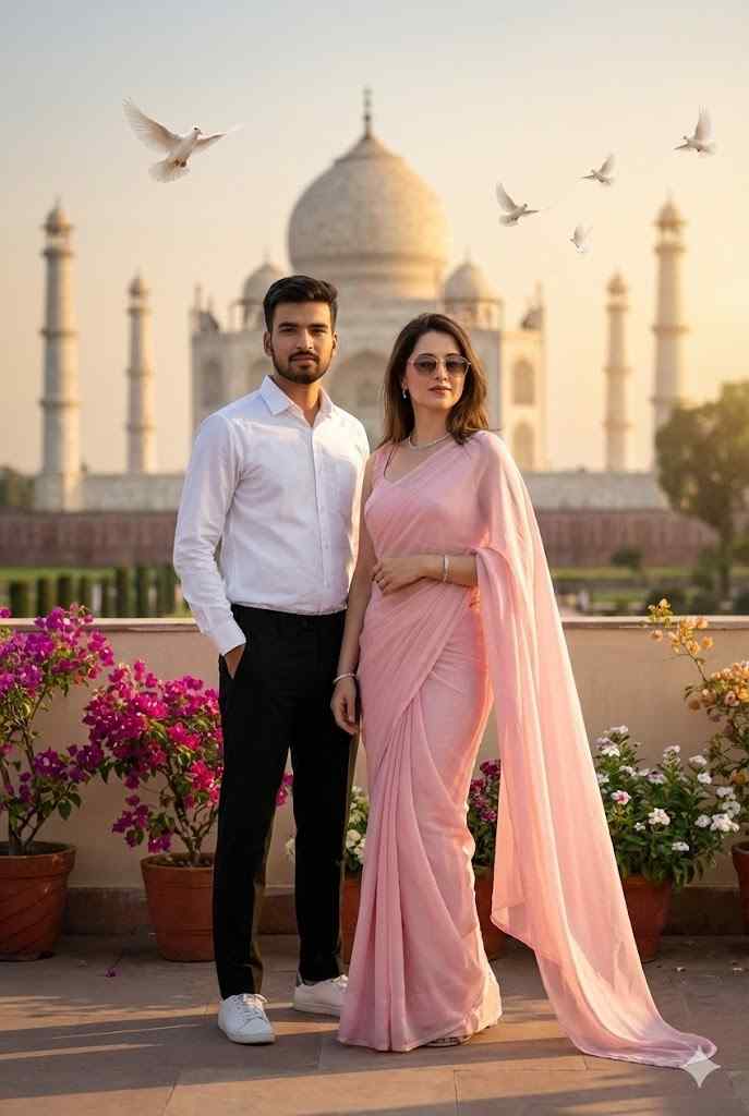 A stylish young Indian couple posing gracefully in front of the Taj Mahal during soft daylight. The boy is wearing a crisp white formal shirt, black trousers, and white sneakers, with neatly styled hair and a trimmed beard, standing confidently with a calm expression. The girl is wearing an elegant pastel pink saree with a flowing pallu, light jewelry, soft makeup, and sunglasses, gently holding the boy’s arm and smiling subtly. White pigeons are flying around them, adding a dreamy cinematic touch. The background features the majestic Taj Mahal with clear blue sky, symmetrical architecture, and heritage aesthetics. Soft natural lighting, shallow depth of field, ultra-realistic skin texture, detailed fabric flow, cinematic composition, professional DSLR photography look, high resolution, Instagram-viral romantic aesthetic.