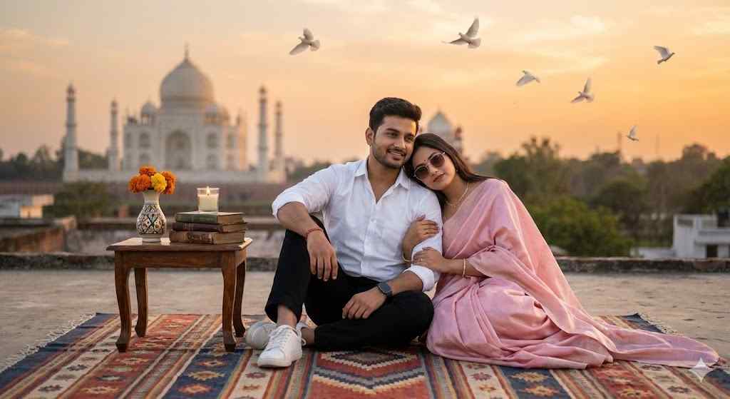 A romantic young Indian couple sitting comfortably on a patterned rug on a rooftop terrace with the Taj Mahal in the background during golden sunset. The boy is wearing a crisp white shirt, black trousers, white sneakers, and a smartwatch, with neatly styled hair and a trimmed beard, sitting relaxed and smiling softly. The girl is wearing an elegant pastel pink saree with a flowing drape, minimal jewelry, soft makeup, and stylish sunglasses, leaning her head gently on the boy’s shoulder. A small wooden table beside them holds a flower vase, stacked books, and a lit candle. White doves are flying in the sky, adding a dreamy cinematic feel. Warm sunset lighting, shallow depth of field, ultra-realistic skin texture, soft shadows, detailed fabric flow, professional DSLR photography look, high resolution, Instagram-viral romantic aesthetic.