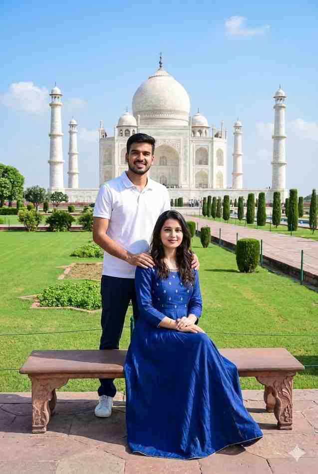 A young Indian couple posing naturally in the lush green gardens of the Taj Mahal on a bright sunny day. The boy is standing behind the girl with a gentle smile, wearing a white polo t-shirt, dark trousers, and white sneakers. The girl is sitting gracefully on a stone bench, wearing a royal blue long ethnic dress, minimal makeup, and soft open hair, smiling calmly at the camera. The majestic Taj Mahal is clearly visible in the background with its white marble dome and minarets, surrounded by manicured lawns, pathways, and green hedges. Clear blue sky with scattered clouds, natural daylight, realistic skin tones, balanced composition, professional DSLR photography look, high resolution, Instagram travel-couple aesthetic.