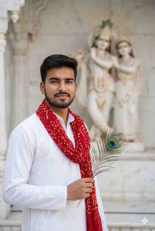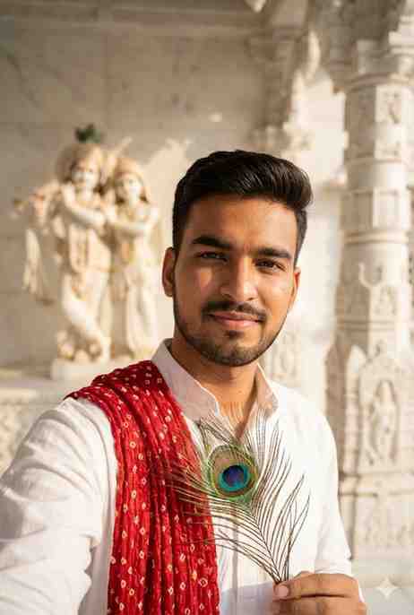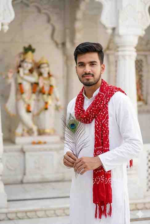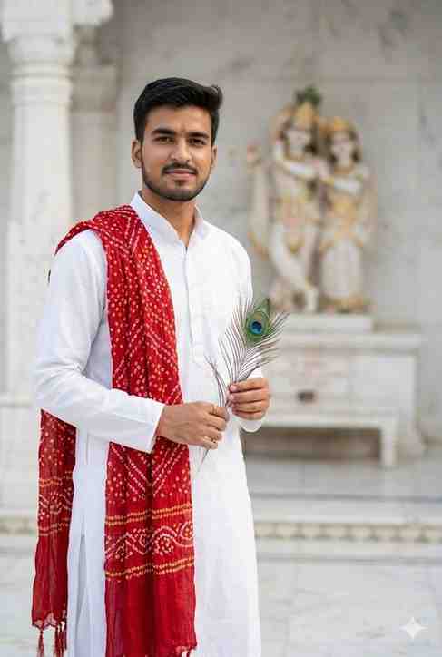 A handsome young Indian man standing confidently inside a white marble Radha Krishna temple, wearing a clean white kurta with a red bandhani dupatta draped around his neck. He is holding a peacock feather (mor pankh) gently in one hand, calm devotional expression, soft smile, sharp facial features, neatly styled hair and trimmed beard. In the background, a softly blurred Radha Krishna idol and detailed marble temple architecture. Bright natural daylight, spiritual and peaceful mood, shallow depth of field, cinematic portrait photography, ultra-realistic skin texture, DSLR quality, high detail, 4K resolution, Instagram viral devotional aesthetic.