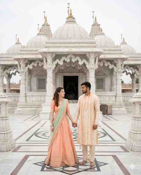 A young Indian couple standing together in the courtyard of a grand white marble Hindu temple. Both are wearing elegant traditional outfits in light pastel tones; the woman in a flowing lehenga with a colorful dupatta, the man in a matching traditional kurta. Intricate marble architecture, carved pillars, and temple façade in the background. Symmetrical floor patterns leading toward the temple, soft daylight, calm devotional atmosphere. Cinematic composition, shallow depth of field, natural skin tones, DSLR photography style, ultra-detailed, 4K resolution, Instagram-viral aesthetic.